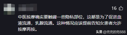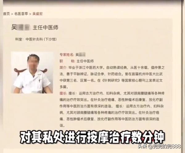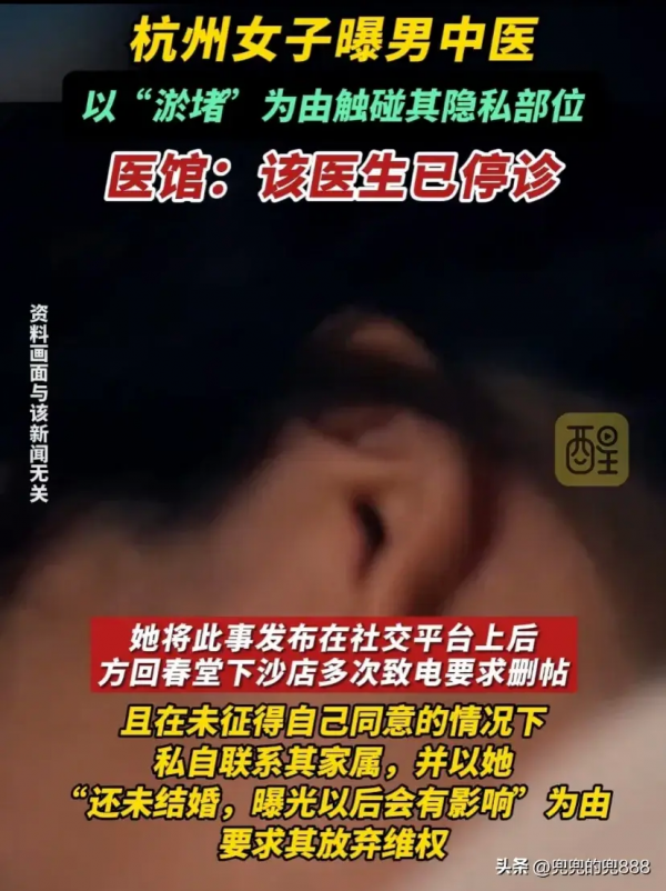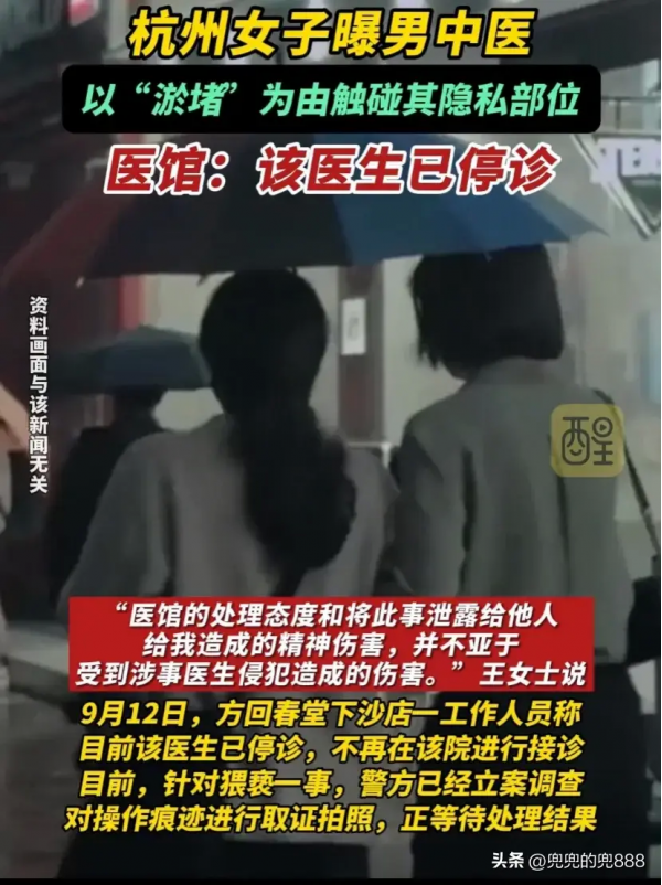 近日,浙江杭州一位王女士在网上爆料称自己在看病过程中,竟然被医馆里一男中医吴大夫以"淤堵"、"手诊"为理由,触摸胸部等隐私部位,而且还不止一次两次!