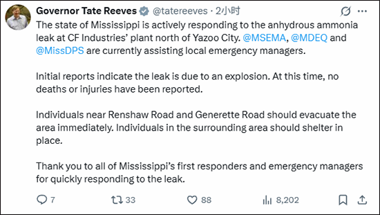 另据密西西比州州长泰特·里夫斯(Tate Reeves)在X平台发布的消息,此次泄漏事件发生在亚祖城北部的CF工业公司。初步报告显示,爆炸是导致泄漏的原因,目前暂无人员伤亡报告。