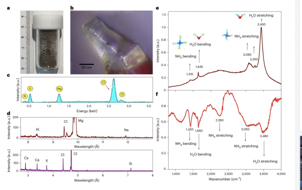 这些水分子是矿物晶体的一部分,通过化学键或氢键与矿物晶体中的其他成分结合。此次新发现的矿物晶体的水分子和铵以水合矿物形式存在,且包含多达六个结晶水分子,水分子在样品中的质量比高达41%。