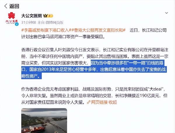 这篇措辞犀利的文章,矛头直指长和实业的港口出售计划。