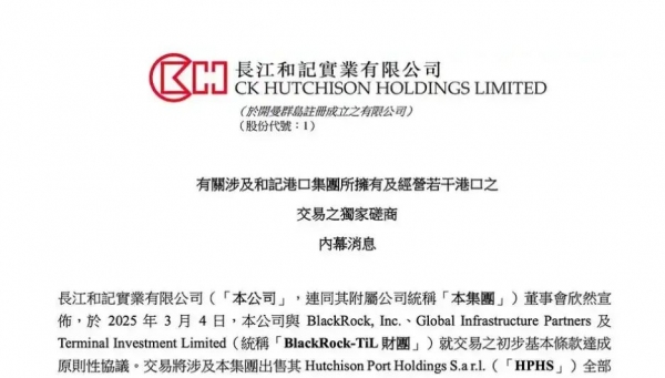 长和公告称与美国贝莱德财团达成原则性协议,出售其部分资产。