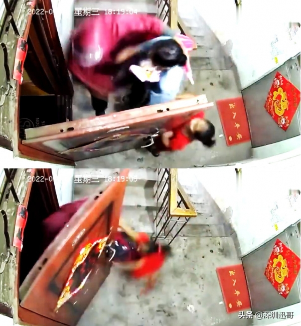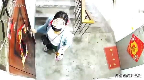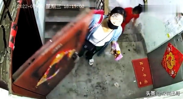 水泥地面,粘了些灰尘,女子穿着拖鞋踩在楼梯台阶上,背着红色小书包往上走,后面跟着一个六七岁的女孩,贴着福字的红色大门前,女子插着钥匙旋转,期间还抬头看了看摄像头的位置,本以为是平常的一次回家。