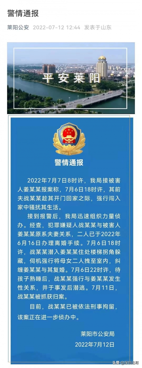通报里还提到,男子叫战某,当日潜入前妻姜某某住处楼梯拐角躲藏,并把母女两强拽进屋里,纠缠着想要复婚,并在晚上22时许,趁着孩子熟睡,强行与姜某某发生性关系,事后潜逃。