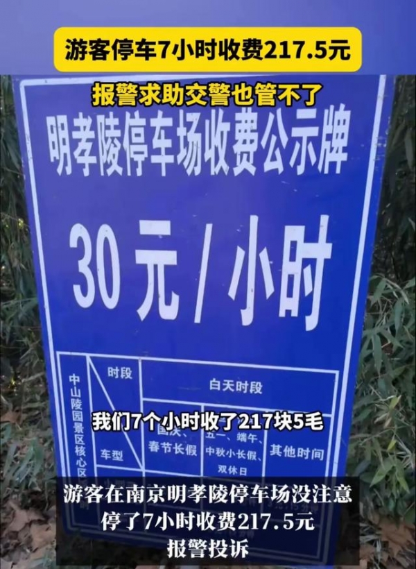 2024 年10 月2日,国庆假期的第二天,南京明孝陵停车场发生了一起令人咋舌的事件。一名游客在停车场停了 7 个小时后,竟被收取了高达 217.5 元的停车费,这一价格让游客惊掉了下巴,直呼"这也太坑人了"。
