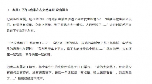 相关讣告,提到杨少华因病抢救无效去世
