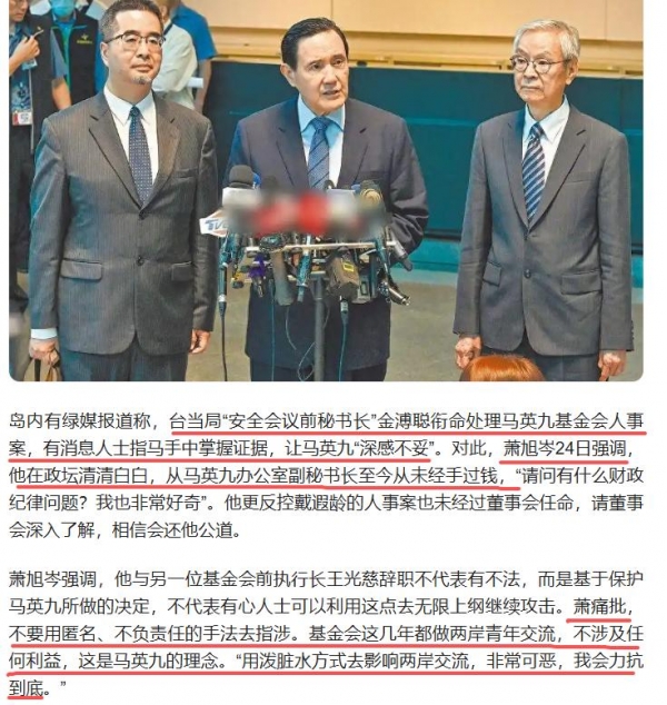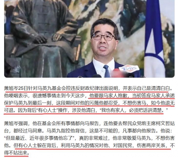 就连马英九也接受访问,说萧旭岑多次赴大陆接触没有报备,甚至还存在财务问题。