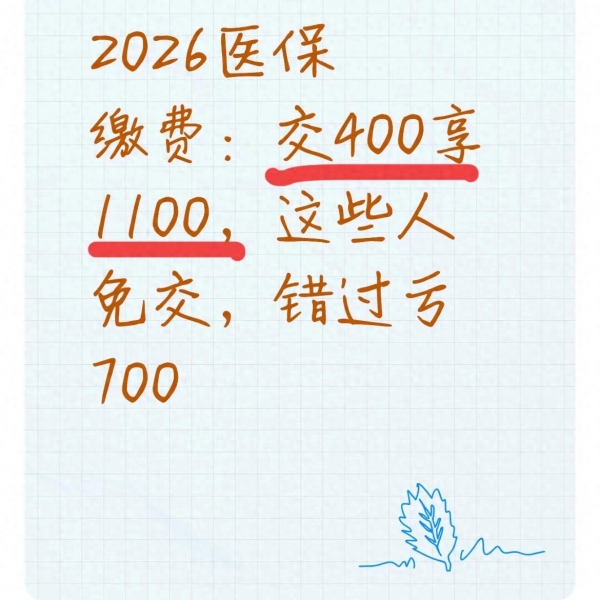 "今年医保又要交钱了?听说得400块,晚交还得多花不少!"刚到社区缴费点,张阿姨就和邻居念叨着。2026年居民医保集中征缴已陆续启动,全国多地明确个人缴费标准为400元/人·年,加上财政补助的700元,每人每年能享受不低于1100元的医保筹资保障。但不少人不知道,部分特殊群体能免交或少交,而错过集中缴费期,个人要多掏700元。这3个关键信息必须弄清,不然既亏钱包又影响待遇。