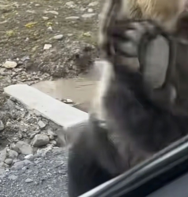 结果就在男子往车外撒食物的时候,在没有任何征兆的情况下,可能是藏马熊感觉距离已经足够靠近了,上来就是一个熊掌猛拍!