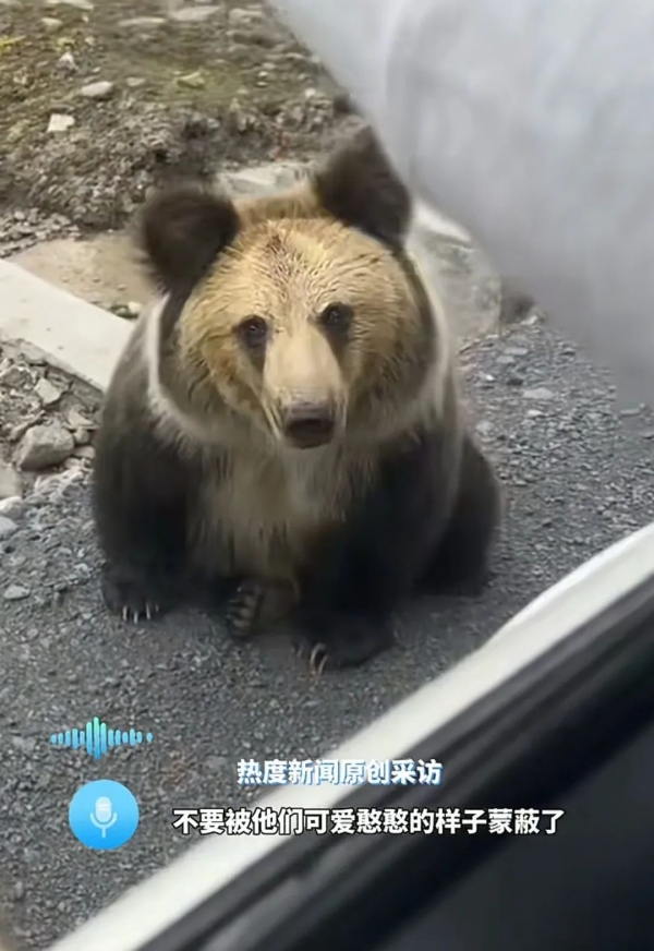 他坐在车上看见藏马熊,可能是觉得很可爱,就开始喂东西吃。刚开始藏马熊也很老实,很可爱的蹲坐在地上,似乎是在等待着食物的投喂?