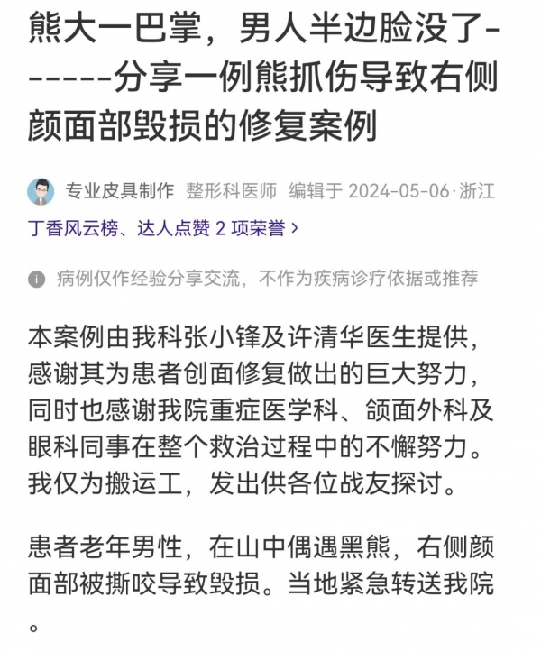 比如有整形医生展示的当地案例,老年男性在山中偶遇黑熊,被黑熊一巴掌就撕掉了半张脸。