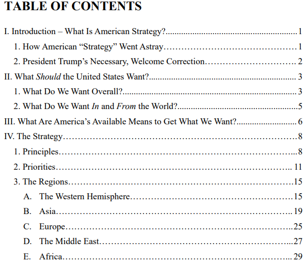 对特朗普而言,这是他第二次发布自己总统任内的《国家安全战略》,也是其第二任期的第一份《国家安全战略》。相比当年他的第一份报告,以及2022年10月拜登政府发布的报告,这份报告从目录开始就透露出鲜明的特朗普特色:目录里去掉了原本冠冕堂皇的修饰,非常直白地以一系列问题--诸如"什么是美国的战略?""美国战略如何离经叛道?""美国应该追求什么?""美国应该如何获得我们所需?"等作为章节标题,这甚至给人一种感觉,这份《国家战略报告》中的相当一部分,可能是才华横溢的特朗普对着几位书记直抒胸臆后,再由秘书或GPT加以总结、修饰、润色而来。