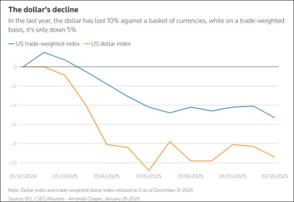 路透社报道指出,2026年开年几周市场动荡,美元再度承压,包括美国政府希望美元走弱等诸多因素,促使投资者重新审视此前对美元将保持一段时期稳定的乐观预期。