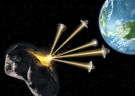 科学家提出了许多理论性的方法,比如欧洲宇航局设计出了用一排人造卫星或火箭推动小行星偏离撞地轨道的方法,还有科学家最感兴趣也是最容易的方法,利用太空飞船与小行星进行碰撞,借此来改变它的运行轨迹,来应对"阿波菲斯"的威胁。