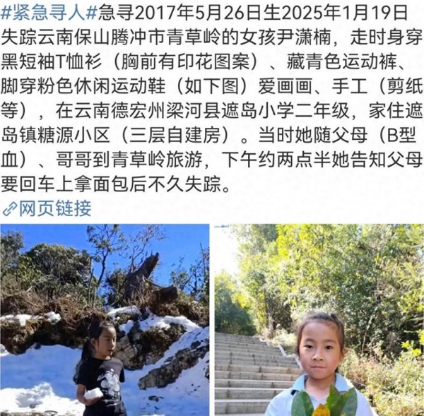 1月19日,云南腾冲的寒假刚开始。一个8岁的小女孩,和父母一起去青草岭玩。她活泼开朗,喜欢画画,生活中处处充满阳光。那天,她因为肚子饿,走去车里拿东西。只是10分钟后,父母才意识到,她消失了。