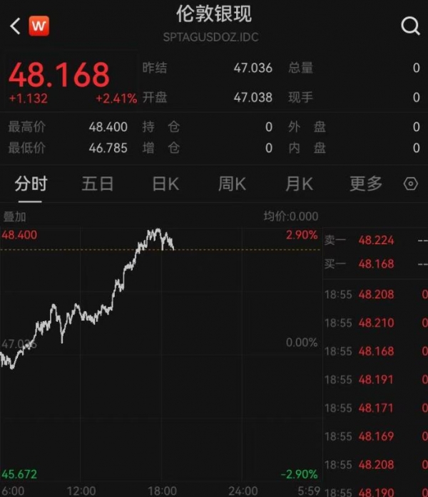 银价同时大涨,现银目前涨幅为2.41%,报48.168美元/盎司。