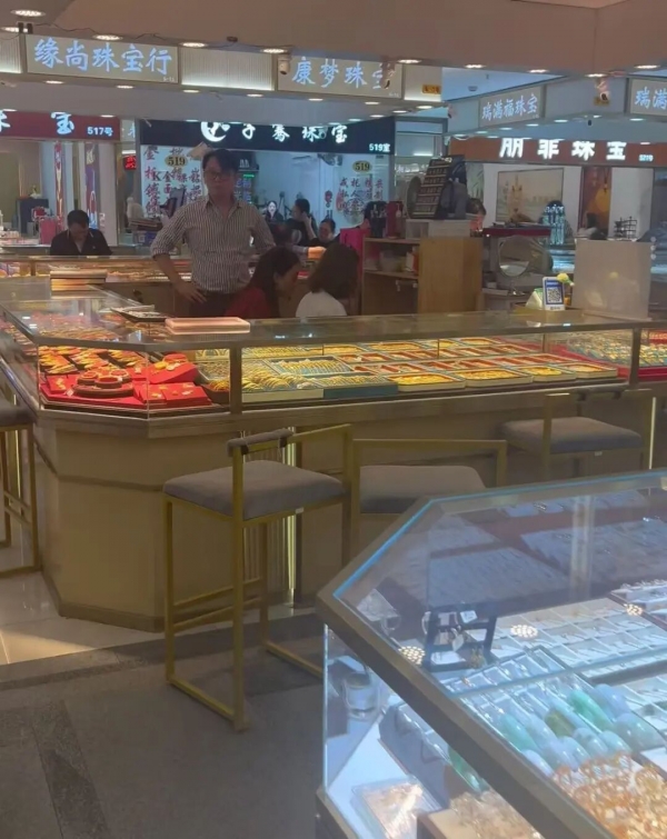 紫锦城共有6层,一楼以老凤祥、周大福等品牌金店为主,从二楼开始都是水贝模式的小规模金店。10月29日中午,一楼各家品牌金柜台前几乎连询价的客人都很少。而二楼开始的水贝金店柜台前客人也稀稀拉拉,好不容易遇到有试戴意愿的顾客店家都会一连推荐很多不同的款式。要知道在金价巅峰时,很多店主疲于招待顾客,大多数时候都在拿着计算器算价格。