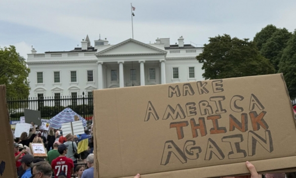 (2025年4月19日,人们聚集在白宫围栏前,抗议特朗普政府的一系列政策)