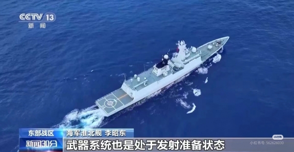 东部战区在台岛周边海域执行战备警巡任务的海军淮北舰开展实兵对抗演练