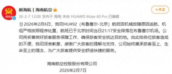 2月7日12时,海南航空官方微博发布通报:2月6日,我司HU492(布鲁塞尔-北京)航班因机械故障原因返航,机组严格按照程序处置,航班已于北京时间当日21:17安全降落在布鲁塞尔机场。