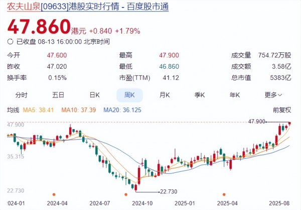 截至2025年8月13日港股收盘,农夫山泉报47.860港元/股,最新市值5383亿港元。