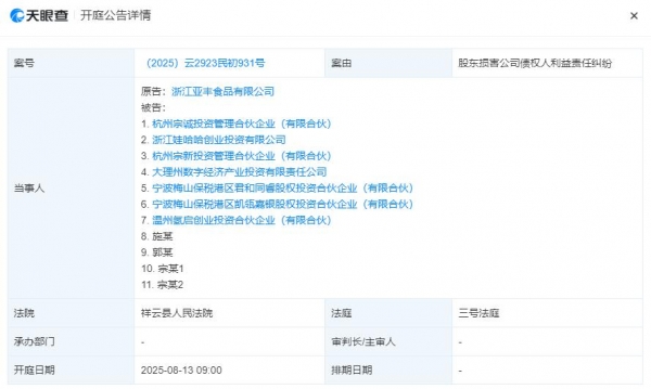 天眼查App显示,近期,祥云县人民法院公告送达原告浙江亚丰食品有限公司与被告宗馥莉母亲施幼珍、宗馥莉、宗馥莉叔叔宗泽后、浙江娃哈哈创业投资有限公司等股东损害公司债权人利益责任纠纷一案起诉状副本、开庭传票等,自公告发出之日起三十日即视为送达,该案定于8月13日下午14:10分在祥云县人民法院开庭审理。