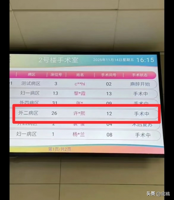 手术室外屏幕上显示,小洛熙在"手术中"。