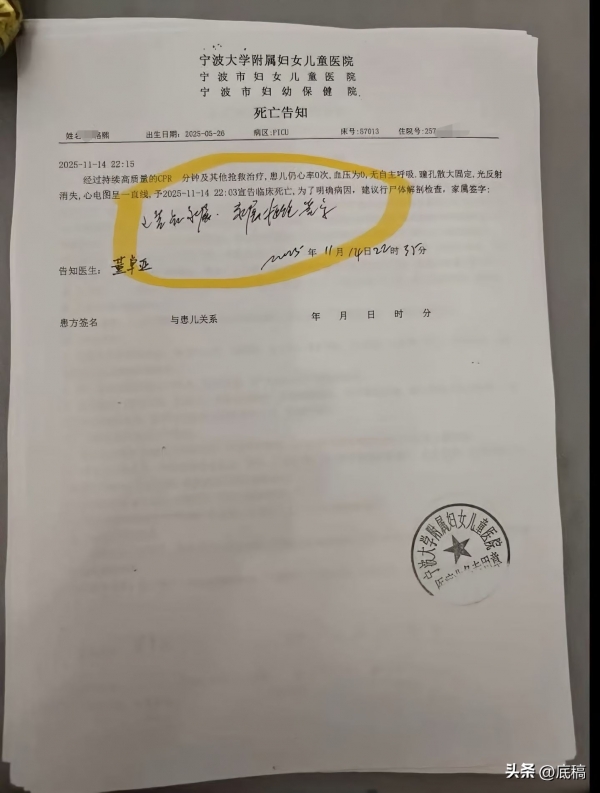 小洛熙的死亡告知。家属供图