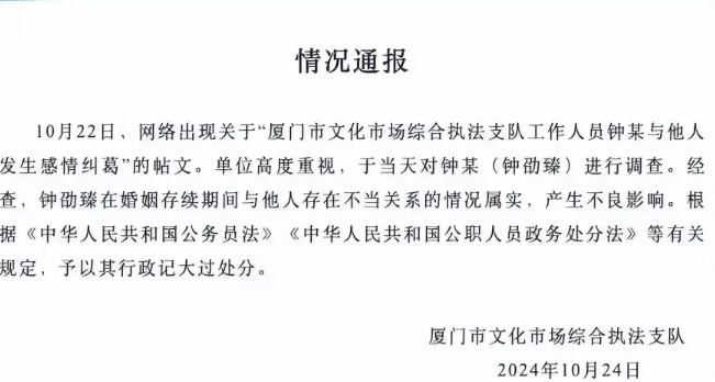 爆料发生后,舆论持续发酵。2024年10月24日,厦门市文化市场综合执法支队发布通报,证实钟某臻先生在婚姻存续期间的确存在不当关系,产生了恶劣影响。根据《中华人民共和国公务员法》和《中华人民共和国公职人员政务处分法》的相关规定,钟某臻先生被处以行政记大过处分。