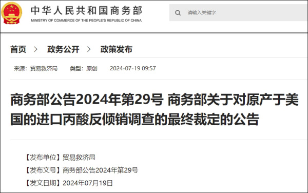 商务部网站7月19日发布《商务部公告2024年第29号 商务部关于对原产于美国的进口丙酸反倾销调查的最终裁定的公告》。