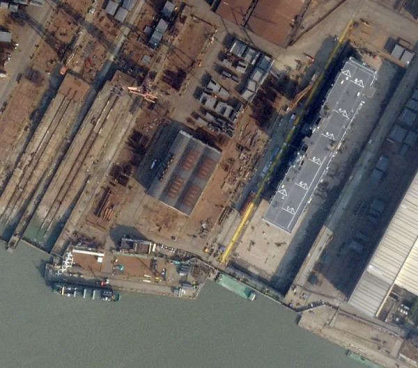 社交媒体上流传的,位于沪东中华船厂的无人僚机(上图);卫星图显示076型的附近有数架无人僚机社交媒体