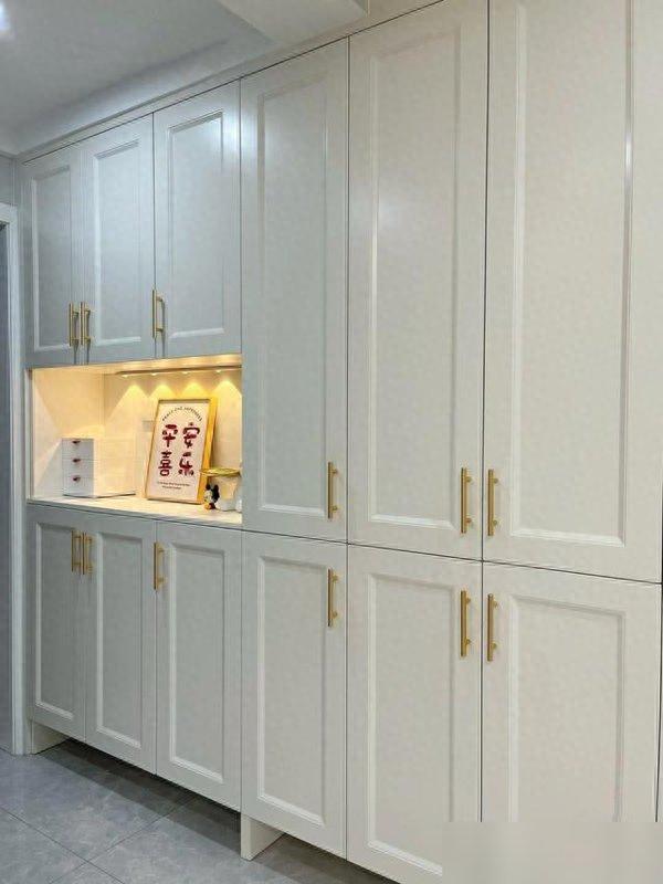 再看玄关和餐边柜,这俩地方最考验"收纳智商"。好多人做玄关柜要么全封闭,开门跟开衣柜似的闷得慌;要么全开放,几天不擦就落一层灰。这户人家直接把玄关柜和餐边柜连成一体,开放格放常穿的鞋子,封闭柜存换季的靴子,中间镂空的地方加了灯带,一进门就能放钥匙、手机,连冰箱都嵌进餐边柜里了--你想啊,平时买了菜直接放进冰箱,不用绕到客厅,做饭的时候端菜也不挤,这样的设计是不是比"为了好看而做的花架子"实用一百倍?