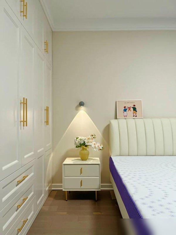 主卧没做吊顶,就走了一圈双层石膏板,床头刷了奶咖色乳胶漆,窗帘颜色跟墙面呼应,晚上开壁灯的时候,连床头的插花影子都软乎乎的--比那些做软包床头、贴壁纸的卧室舒服多了,毕竟软包用久了会积灰,壁纸翘边了还得重新贴,这种"简单到极致"的设计,才是能住十年的样子啊。