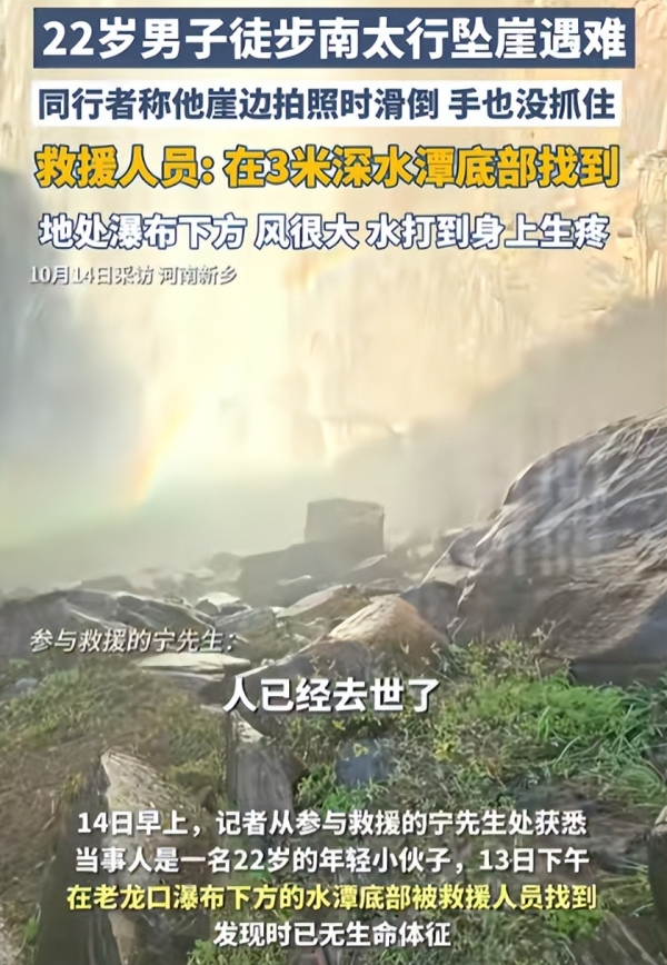 河北一个 22 岁的小伙子,刚上大学的年纪,跟4个网上认识的"徒步搭子" 一起走南太行的路线,走到老龙口瀑布的二道崖就出事了,直接从悬崖上跌落下来。