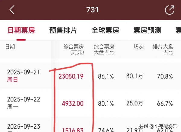 国庆档还没杀到,这边《731》的热度就像泡沫一样逐渐缩水,观众的情绪也跟着潮水退了下去。说到底,这部片子刚一亮相就靠着话题和题材带动情怀消费,单日顶点窜到4亿多,可风头只维持了那么两天。等到9月23号这个工作日,票房直接地心跳水--上午才1500万出头,全天预估也撑死2500万。对比周末一天2.3亿的盛况,这落差有点像打游戏砍boss,突然卡bug被秒了。