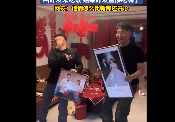 10月2日,河北,男子结婚前一天,叫好友来吃饭 结果好友直接吃嗨了,拿着两人的结婚照蹦迪跳舞,网友:他俩怎么比新郎还开心。