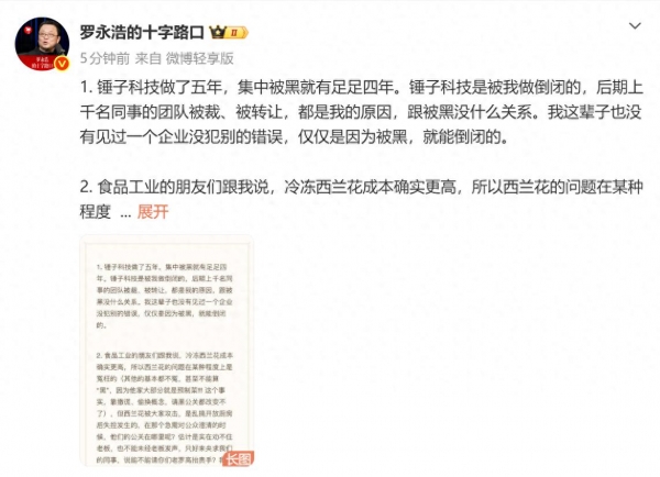 1月16日下午,@罗永浩的十字路口 发布长文回应近日西贝创始人贾国龙的相关言论。罗永浩在文章中称,"锤子科技做了五年,集中被黑就有足足四年。锤子科技是被我做倒闭的,后期上千名同事的团队被裁、被转让,都是我的原因,跟被黑没什么关系。我这辈子也没有见过一个企业没犯别的错误,仅仅是因为被黑,就能倒闭的。"
