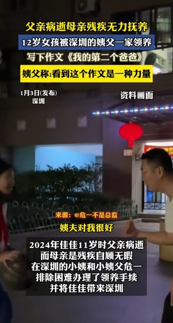1月4日(报道),广东深圳。"我的第二个爸爸",一篇孩子写的作文背后是一个家庭在风雨中紧紧相依。