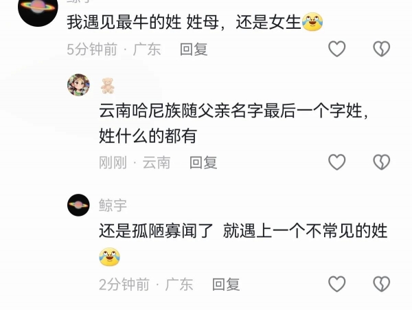 一位广东的网友说,我遇见最牛的姓,姓母,还是女生。
