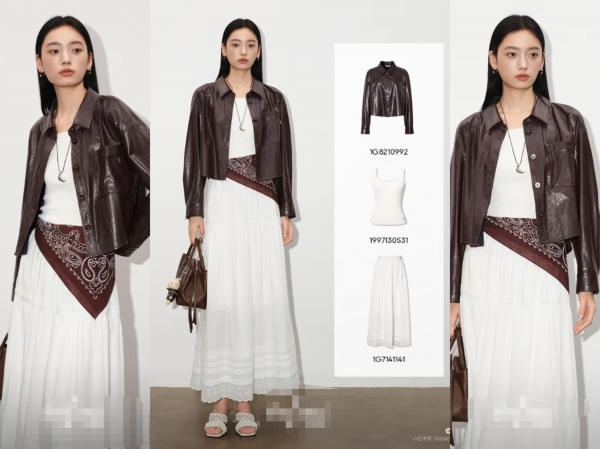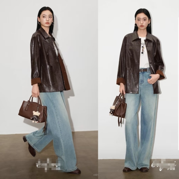 造型通过棕色皮外套的休闲宽松,展现出一种舒适自在氛围,牛仔裤的随性自在,进一步强调造型松驰感。棕色包包和皮鞋与皮外套形成呼应,整体呈现出一种潇洒不羁的时髦感。