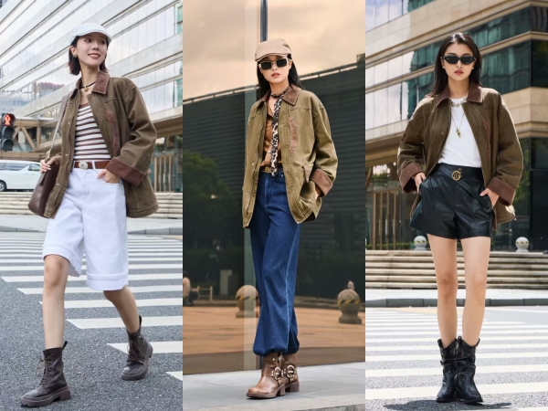 通过不同的下装,选择不同的靴子搭配,让整体呈现出风格一致的美感。比如内搭条纹衫和短裤,选择马丁靴搭配,休闲复古又帅气。下装搭配牛仔裤,选择铆钉靴,则呈现出一种西部牛仔风格。