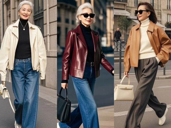这种款式相比机车夹克,适合年龄更广泛。即便五六十岁女性穿上也不违和,搭配裤装或裙装,轻松穿出好看时髦显年轻造型。