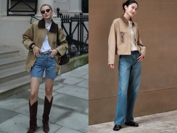 谷仓夹克也有不同长度,矮个子女性,建议选择长度在胯骨下3-5cm处的款式,更利落显高。高个子女性,则适合选择在大腿中部的长度,随性自在。