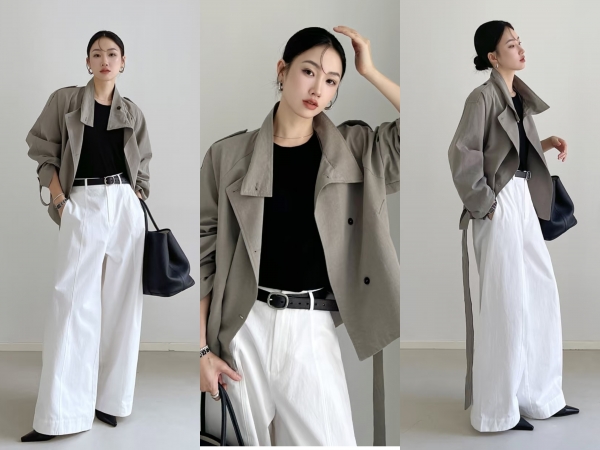 日常喜欢优雅气质的女性,可以选择灰卡其短风衣,内搭黑色打底衫叠穿,下装搭配白色阔腿裤和黑色尖头高跟鞋,穿出时尚大方造型。