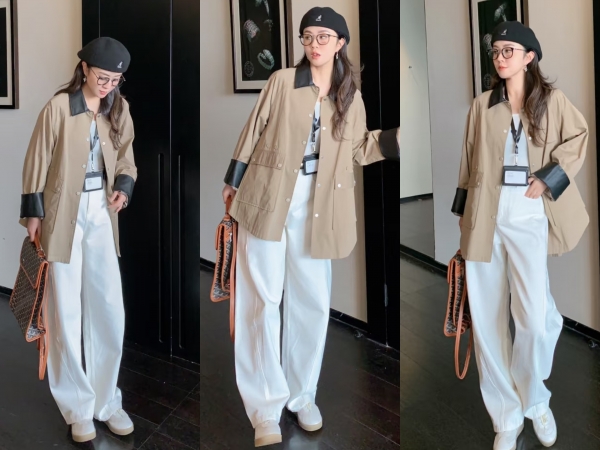 造型通过内搭和裤子及鞋子的顺色搭配,竖向拉长身体线条,凸显身高。黑色贝雷帽与外套的领子和袖口形成呼应,使整体呈现出休闲简约却层次丰富的造型。