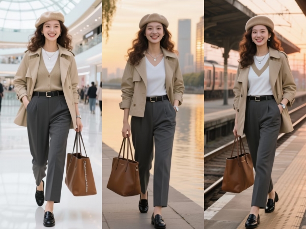 身处职场的女性,这种季节选择卡其色短风衣,内搭白色打底衫叠穿,下装搭配九分西裤和乐福鞋,轻松穿出职场女性的干练与利落气质,好看又时髦。