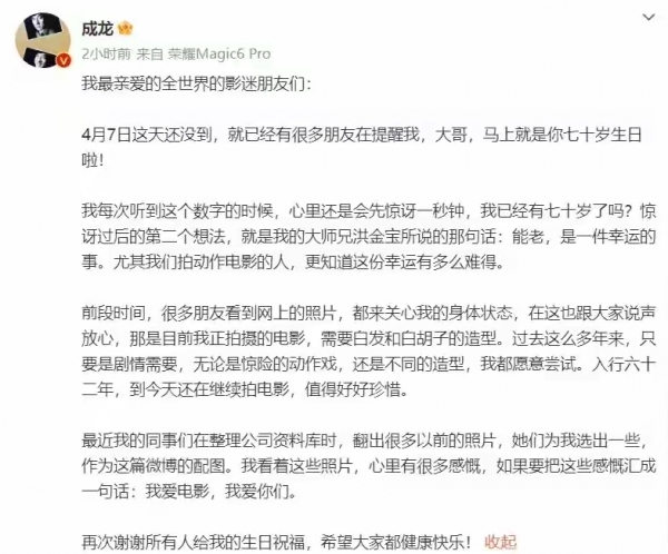 面对这种无端指控和伤害性的谣言,成龙大哥并没有选择激烈的反击方式。相反,在11月11日通过微博宣布新电影定档2026年1月1日的消息,并以幽默的方式邀请大家"过家家",巧妙地粉碎了这一虚假新闻。