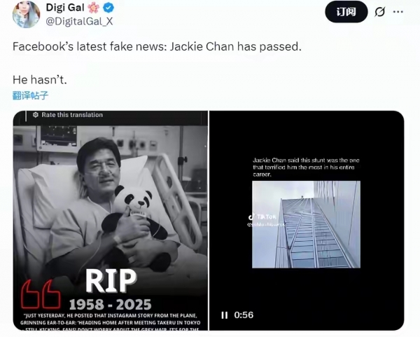 11月10日,这条消息在外网上突然爆发,并迅速登上热搜榜。配图中成龙躺在病床上的照片实际上是AI合成的产物,原图出自2024年的电影《暗影边缘》剧照。更荒谬的是,造谣者甚至将成龙的出生年份由1954年错误地标为1958年。
