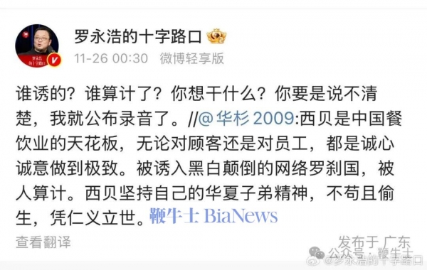 此前,华杉在微博再次点评西贝事件,称西贝被人算计,暗示罗永浩是罗刹国,引发罗永浩回怼。