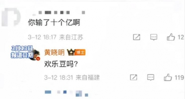 其实去年谣言刚出来的时候,黄晓明就回应过一次,当时有网友在他微博评论区硬刚:"你是不是输了十个亿?"换别人要么冷处理,要么急眼回怼,黄晓明直接调侃:"欢乐豆吗?"