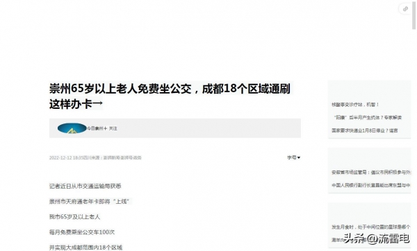 比如四川省崇州市,65岁以上的老年人,凭借天府通老年卡每月可以免费乘坐公交车100次,并实现大成都范围内18个区域互刷互通。